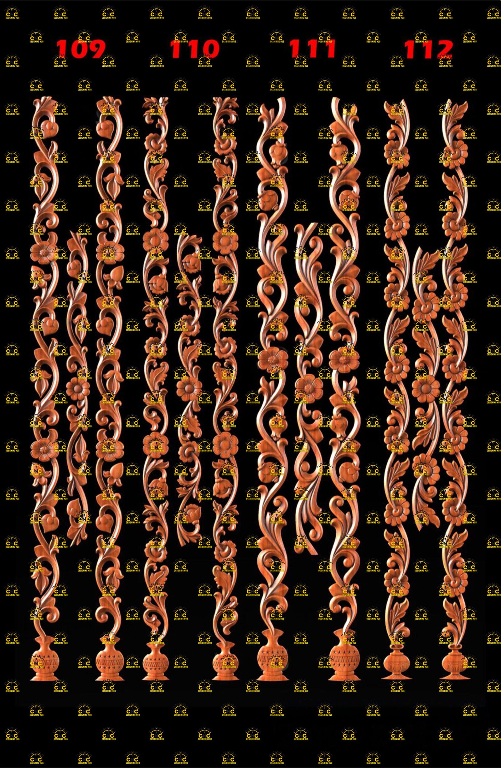Premium CNC wooden carving designs collection, specially crafted for main doors, double doors, temple pillars, railing posts, staircase columns, and decorative architectural projects.