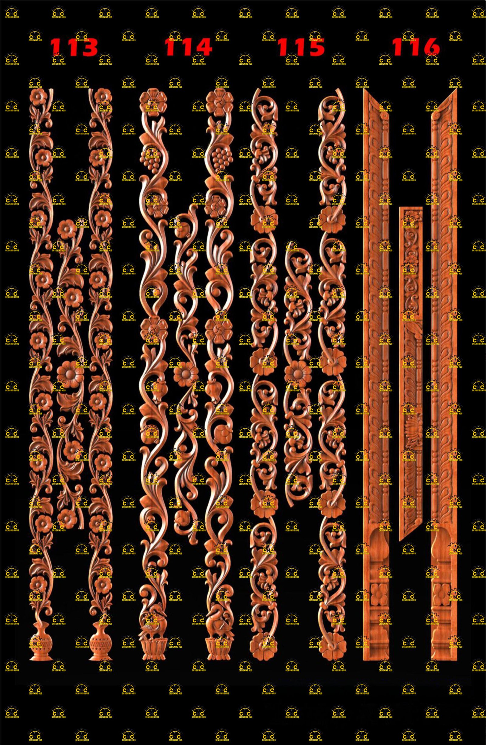 Premium CNC wooden carving designs collection, specially crafted for main doors, double doors, temple pillars, railing posts, staircase columns, and decorative architectural projects.
