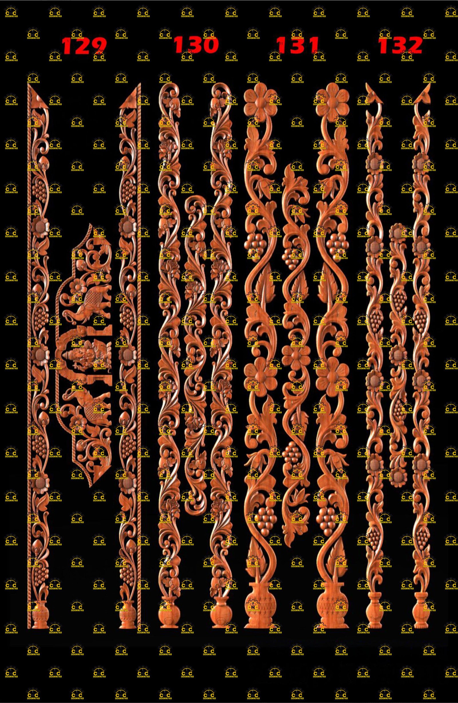 Premium CNC wooden carving designs collection, specially crafted for main doors, double doors, temple pillars, railing posts, staircase columns, and decorative architectural projects.